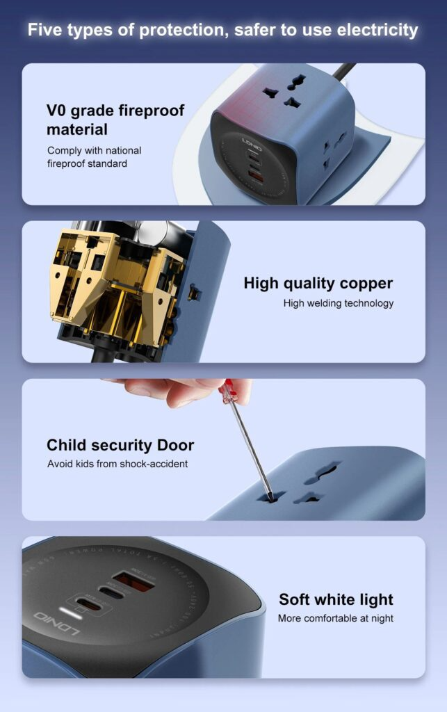 Safety Features: Includes LDNIO smart chip technology to prevent overcharging, over-current, and short circuits, ensuring the safety of your connected devices.